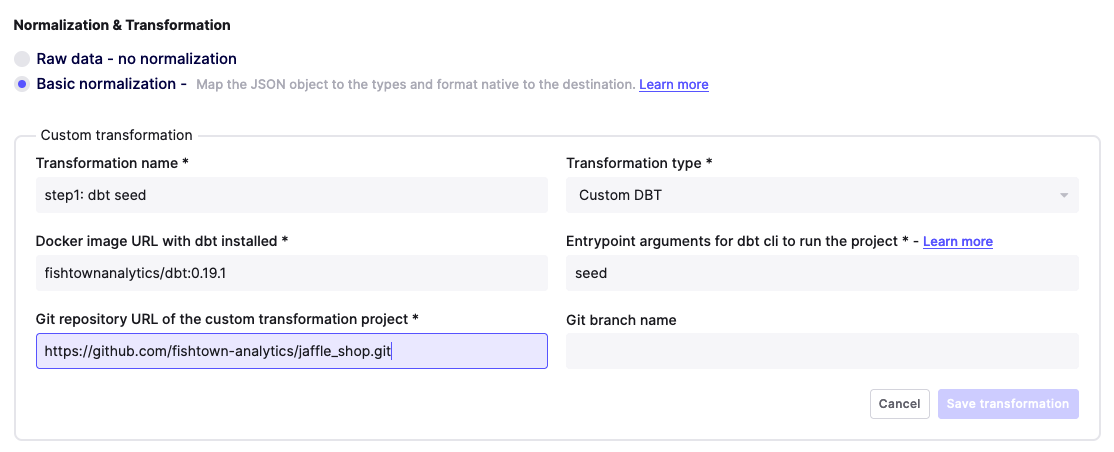 In the connection settings page, I can add new Transformations steps to apply after normalization. For example, I want to run my custom dbt project jaffle_shop, whenever my sync is done replicating and normalizing my data.